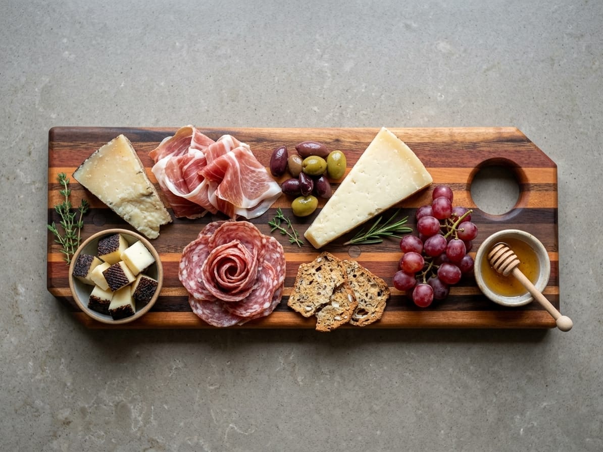 Nossa tábua marchetada para frios mede 16 x 40 cm, foi desenvolvida para ser mais leve e prática, sem perder a beleza do trabalho artesanal em madeira.