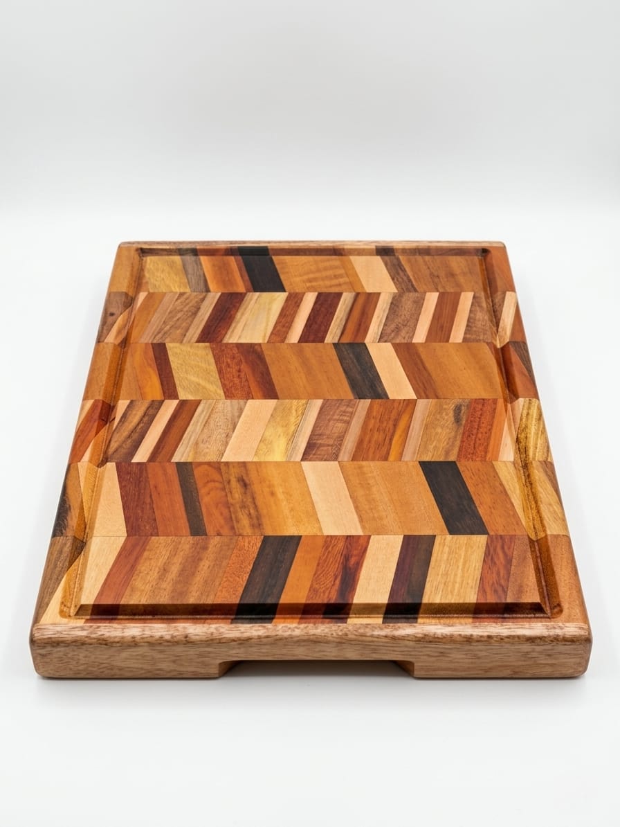 Feita em madeira maciça, essa tábua traz a beleza da marchetaria, uma técnica artesanal que combina diferentes madeiras para criar padrões únicos.